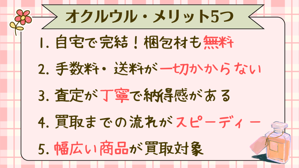 自宅で完結する手軽さや、手数料・送料が無料といったメリット、丁寧な査定やスピーディーな入金など、初めてでも安心して使えるポイントが揃っています。ここでは、私が感じたオクルウルのメリットを5つ紹介します。