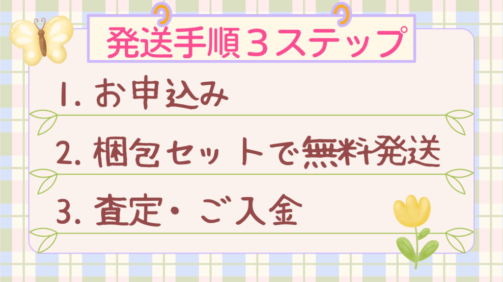 メルカリやヤフオクのように、写真撮影やコメント対応・値下げ交渉など面倒な作業は一切ありません。発送するだけで、あとはすべて任せられる仕組みです。